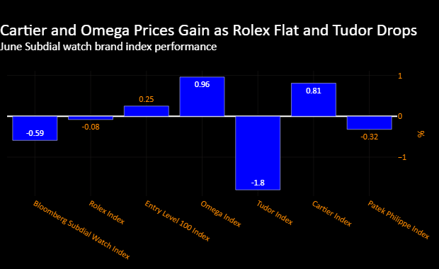 在6月份,占大多数指数的劳力士型号基本持平,而姐妹品牌Tudor下降。根据Subdial的数据显示,入门级奢侈手表的价格以及斯沃琪集团的欧米茄和卡地亚品牌指数在该月显示出适度增长。