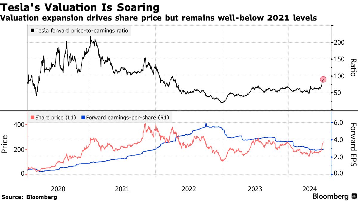 特斯拉在为期11天的涨势中飙升了44%,这是自2023年6月以来最长的涨势。根据彭博社编制的数据,该股现在以90倍的未来收益交易,这一水平最后一次出现在2022年初。