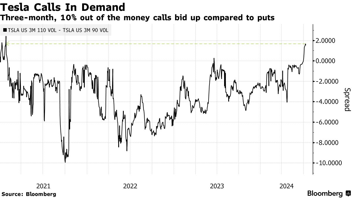 交易员正在提高特斯拉看涨期权的价格,相对看跌期权,这显示了他们更希望进一步追涨的愿望,同时对于股价下跌的避险需求较为温和。