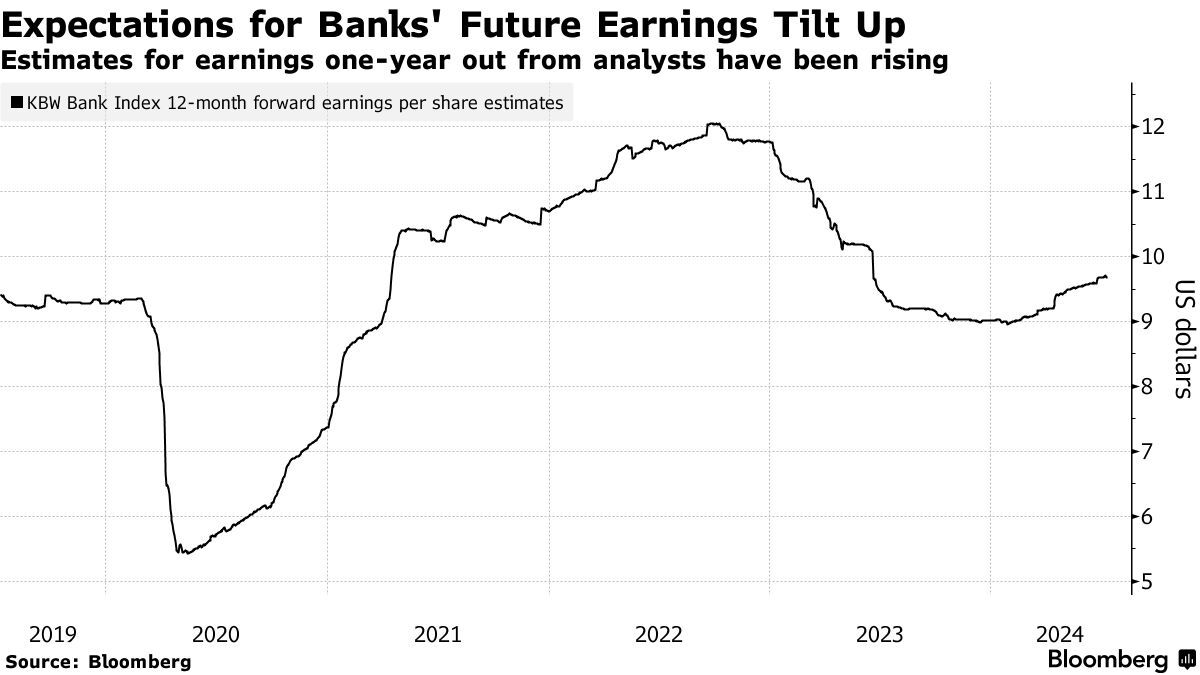 看好该行业的投资者可以指出华尔街对未来12个月银行每股收益的预期,这一预期看起来与去年中期以来一样乐观。这种乐观情绪的一部分源于预期美联储最终将降息,这可能会降低存款成本,缓解信贷担忧并提振资本市场。