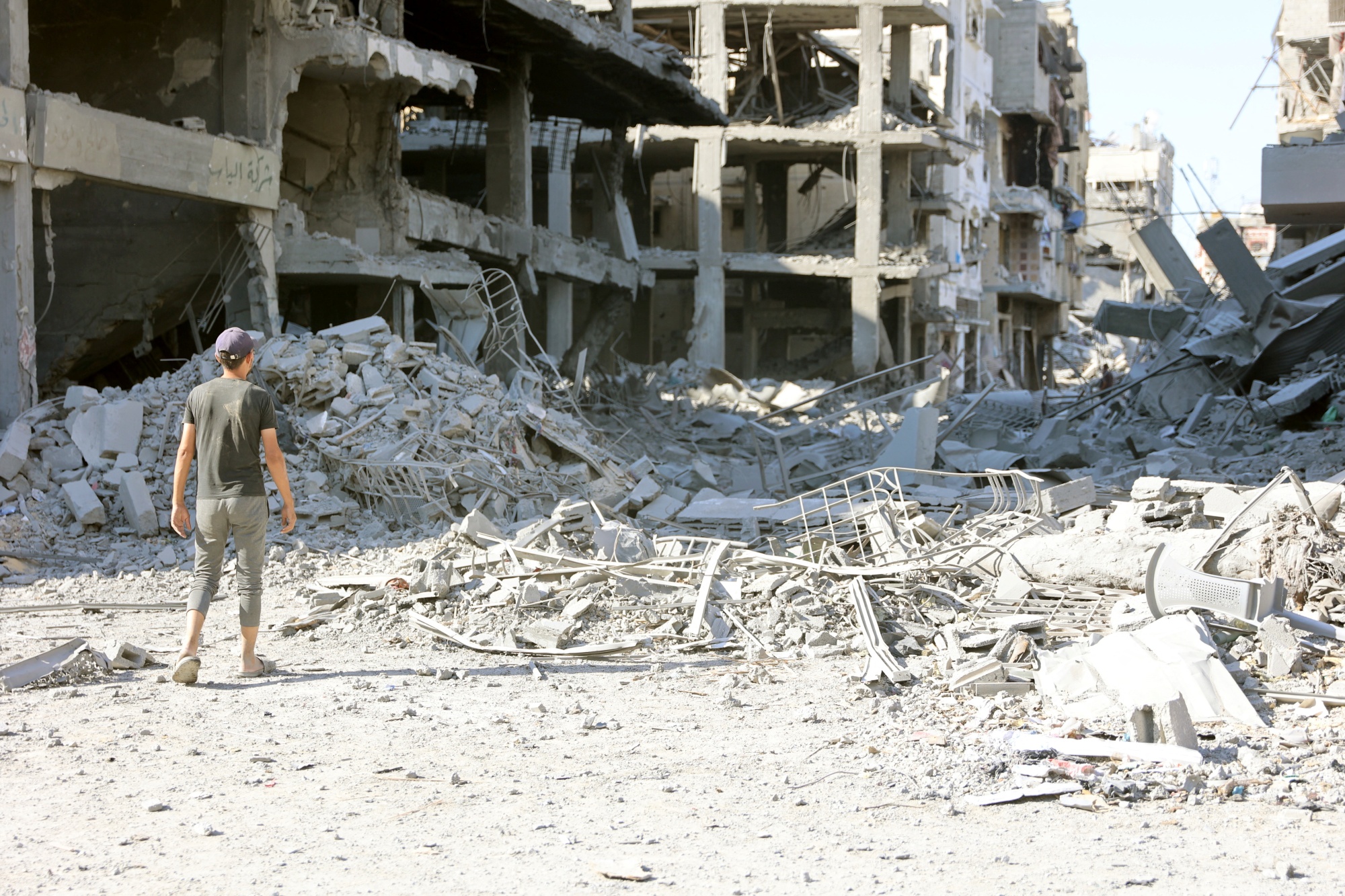 一名居民在7月10日以色列军队撤离加沙市后看着被摧毁的建筑物和瓦砾。