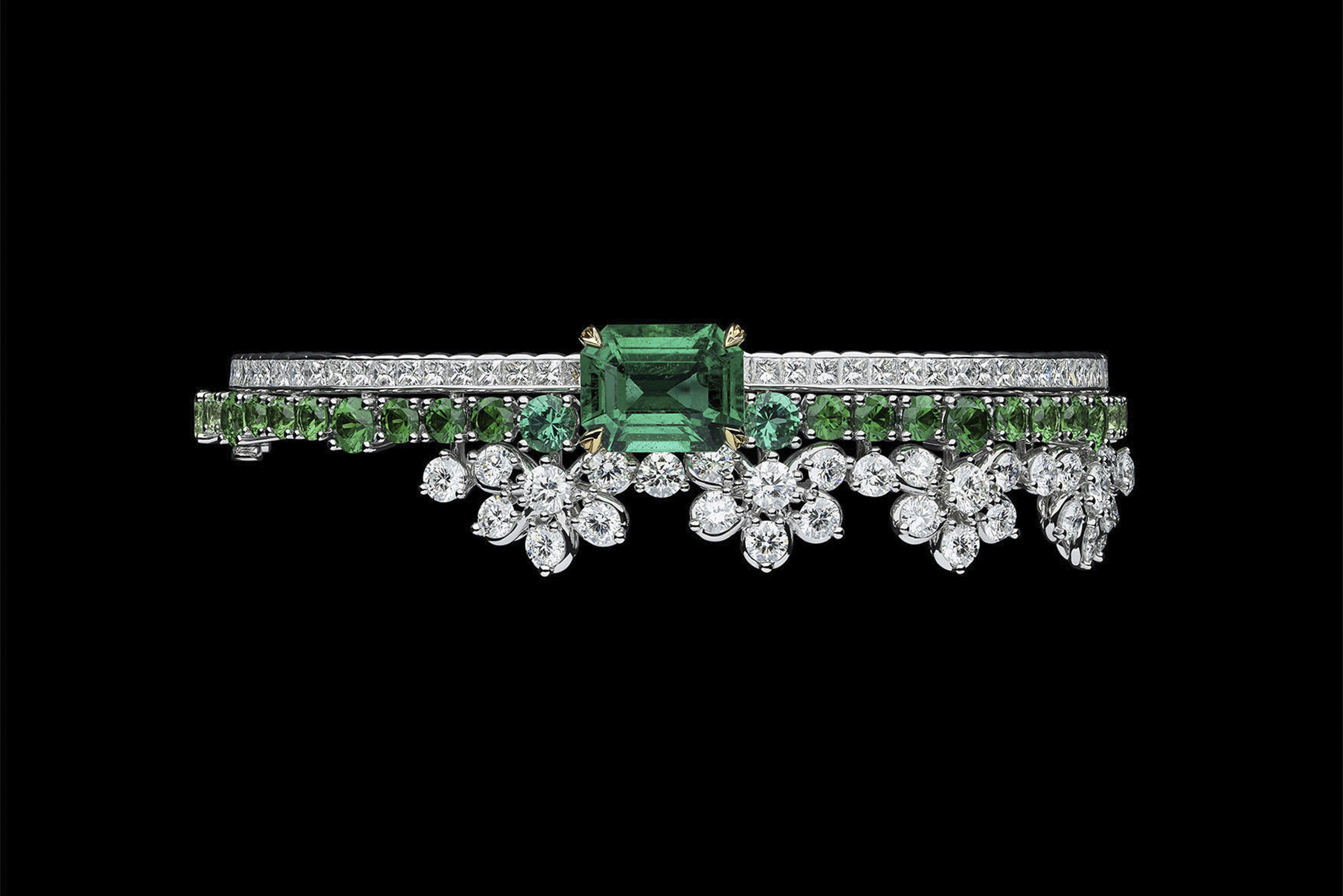 新的迪奥Délicat系列融合了另外两个系列,迪奥Galons和迪奥Dearest,创造出了新的东西。极简主义的设置展示了丰富的彩色宝石,呈不对称、极具女性魅力的设计。这款手镯结合了钻石、翡翠和绿锆石。钻石和绿色宝石的刚硬线条被从一侧垂下的钻石花朵所柔化。中心是一颗重要的翡翠。