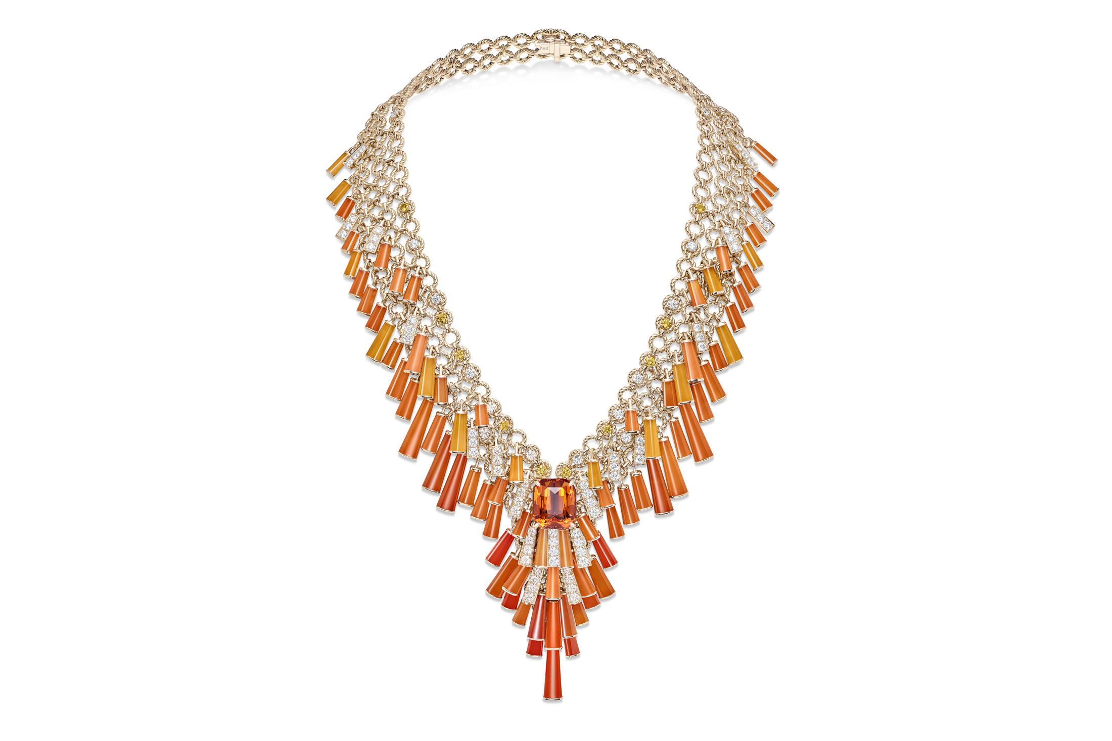 珠宝和手表艺术总监斯蒂芬妮·西维尔向该品牌的一些标志性设计致敬,但确保设计大胆而现代。该品牌以在“大三宝石”——红宝石、翡翠和蓝宝石之外大量使用色彩斑斓的宝石以及精通镶嵌工艺而闻名。这条项链由不同色调的红玉髓与钻石和黄宝石交替而成的渐变效果。中央石是一颗美丽的21.23克拉斯伯石榴石。