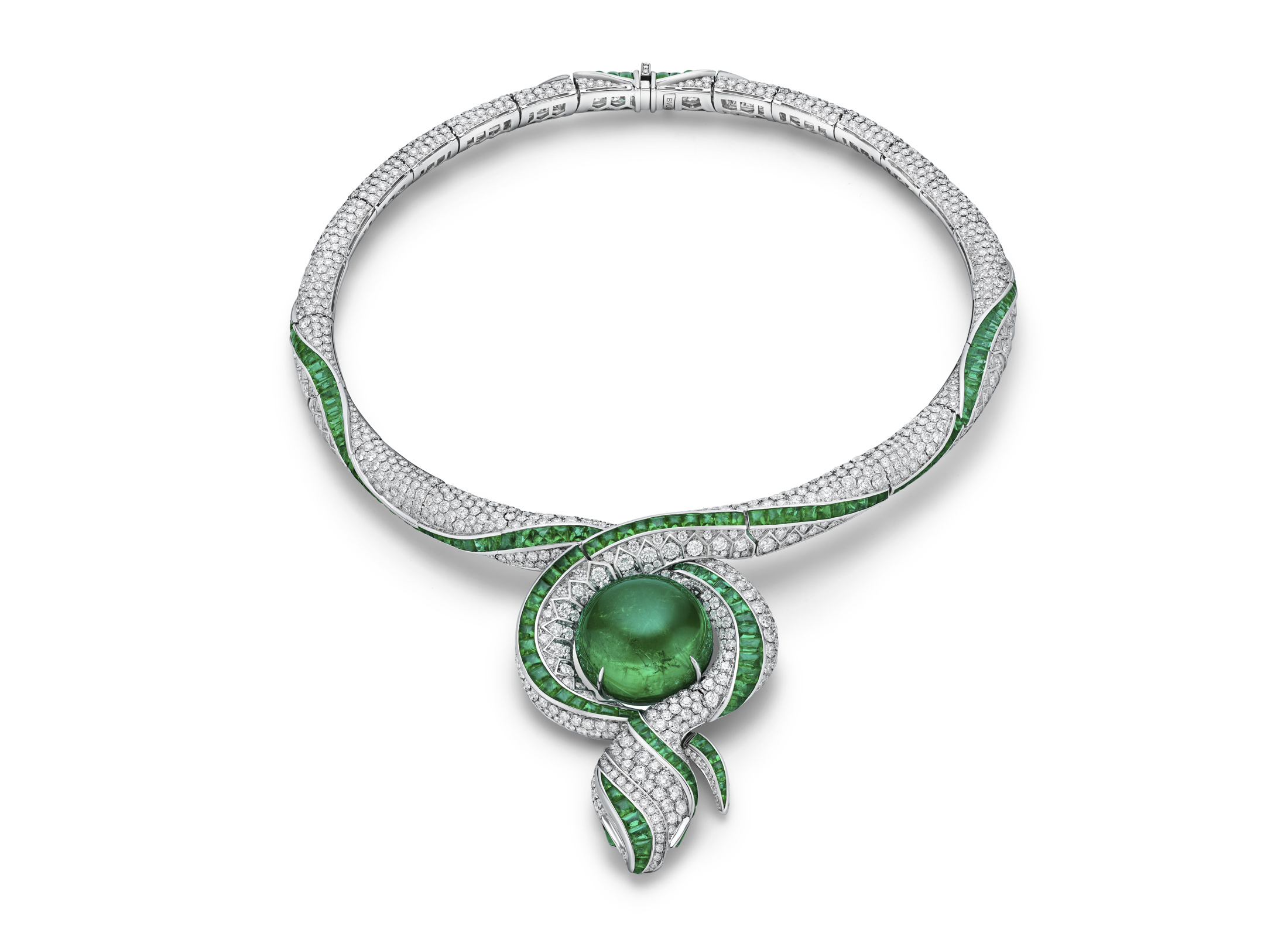 其他亮点包括对其标志性蛇形图案的更抽象诠释。图片中的项链中心镶有一颗63.86克拉的圆形翡翠,位于盘旋的蛇身中央。翡翠丝带在镶嵌钻石之间盘旋,钻石的大小逐渐增大,靠近蛇头处。