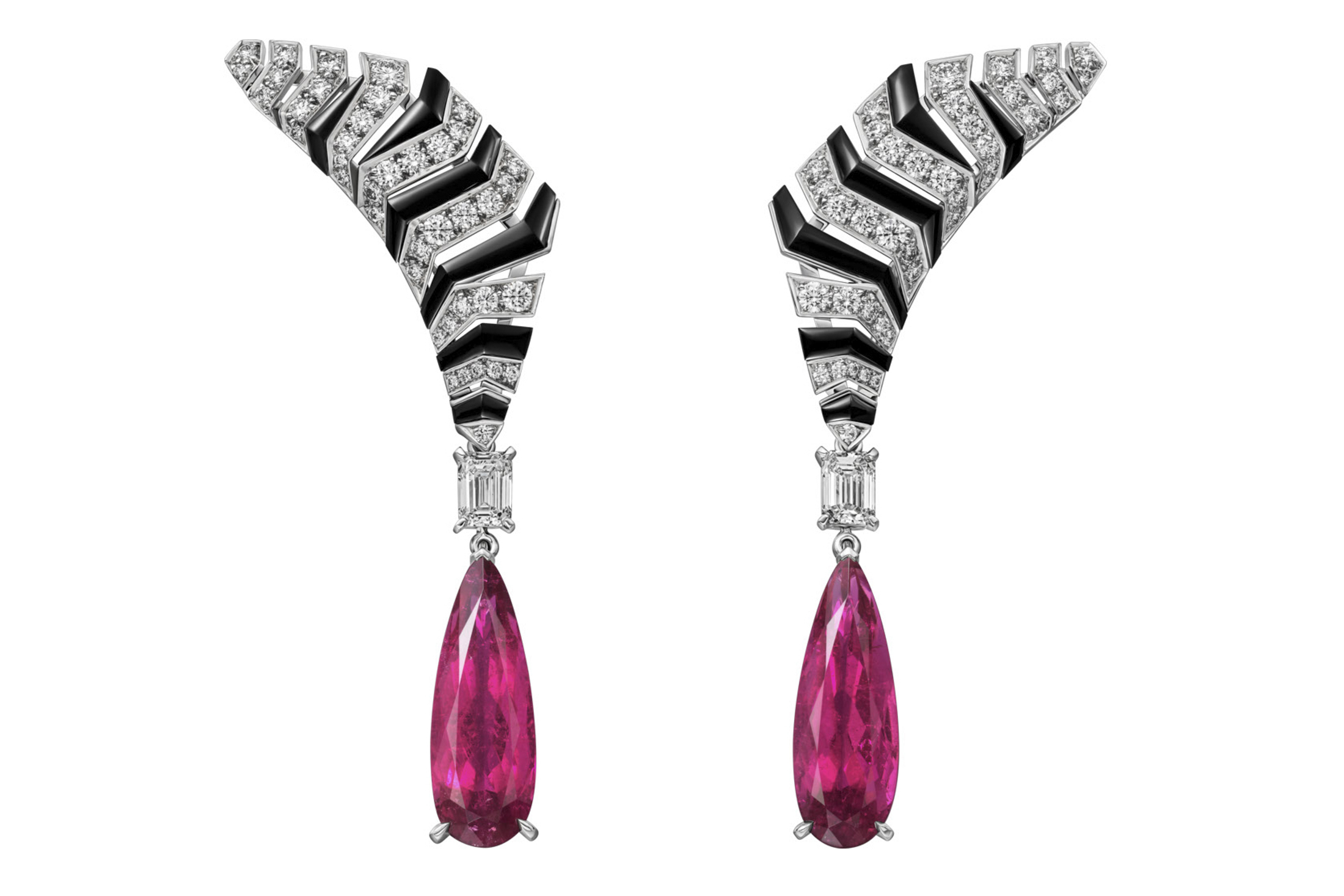 令人惊叹的Koaga套房采用18K白金、钻石和缟玛瑙,以斑马的抽象诠释。 项链采用开放式设计,配有钻石排列和缟玛瑙条纹,最终呈现出斑马头部的轮廓,上面是一个祖母绿切割钻石和一个6.25克拉的红碧玺。 这种开放式设计使皮肤的细条可以从项链中露出,增添了意想不到的性感触感。 项链配有相配的耳环。