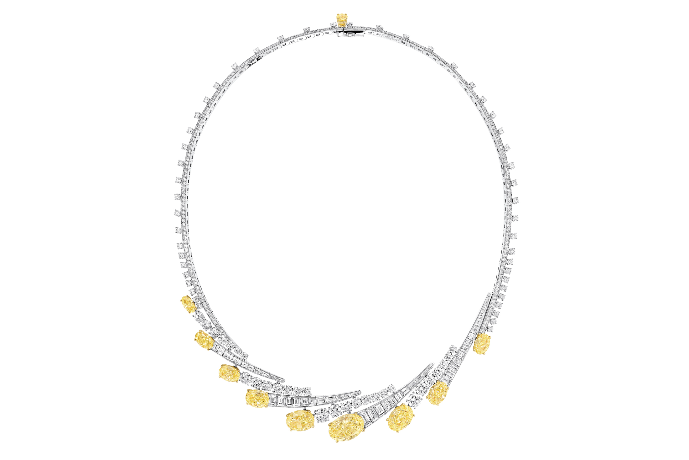这条项链几乎看起来像是火流星划过天空。每个都镶有圆形和长方形白钻,并镶有黄色椭圆形切割的花式黄钻。总共有21.61克拉的黄钻石和17.69克拉的白钻。