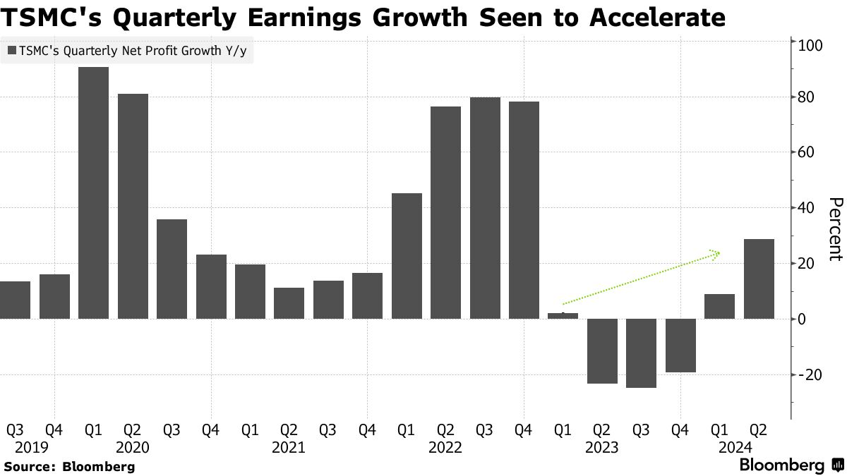 全球最大的代工芯片制造商可能会在周四报告第二季度净利润增长29%,根据彭博社调查的分析师中位数估计。更重要的是,从摩根大通公司到摩根士丹利的分析师们都预计,台积电还将提高全年销售指引,从而证明其估值将再次扩张。