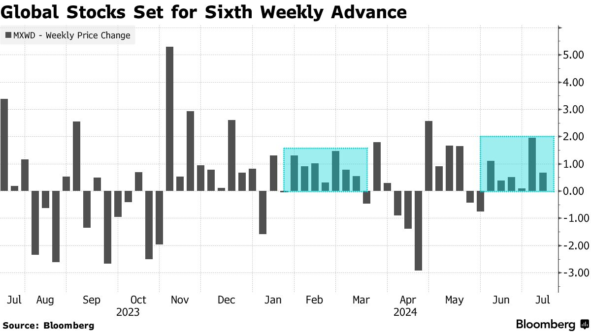 - 亚洲科技股下跌,呼应了华尔街的跌势,因为美国通胀放缓引发了对大科技股的轮换。尽管如此,全球股市将迎来第六周的上涨,这是自三月以来的最长涨势。