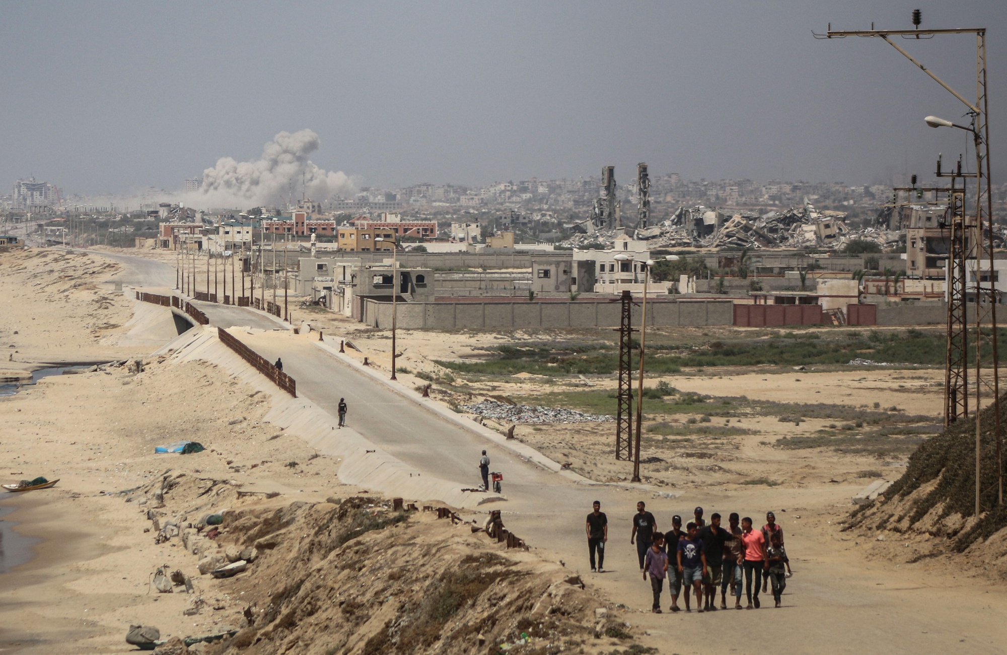 周三,以色列空袭后,烟雾在加沙城南部升起,巴勒斯坦人逃离。摄影师:Ahmad Salem/Bloomberg### 全球必读