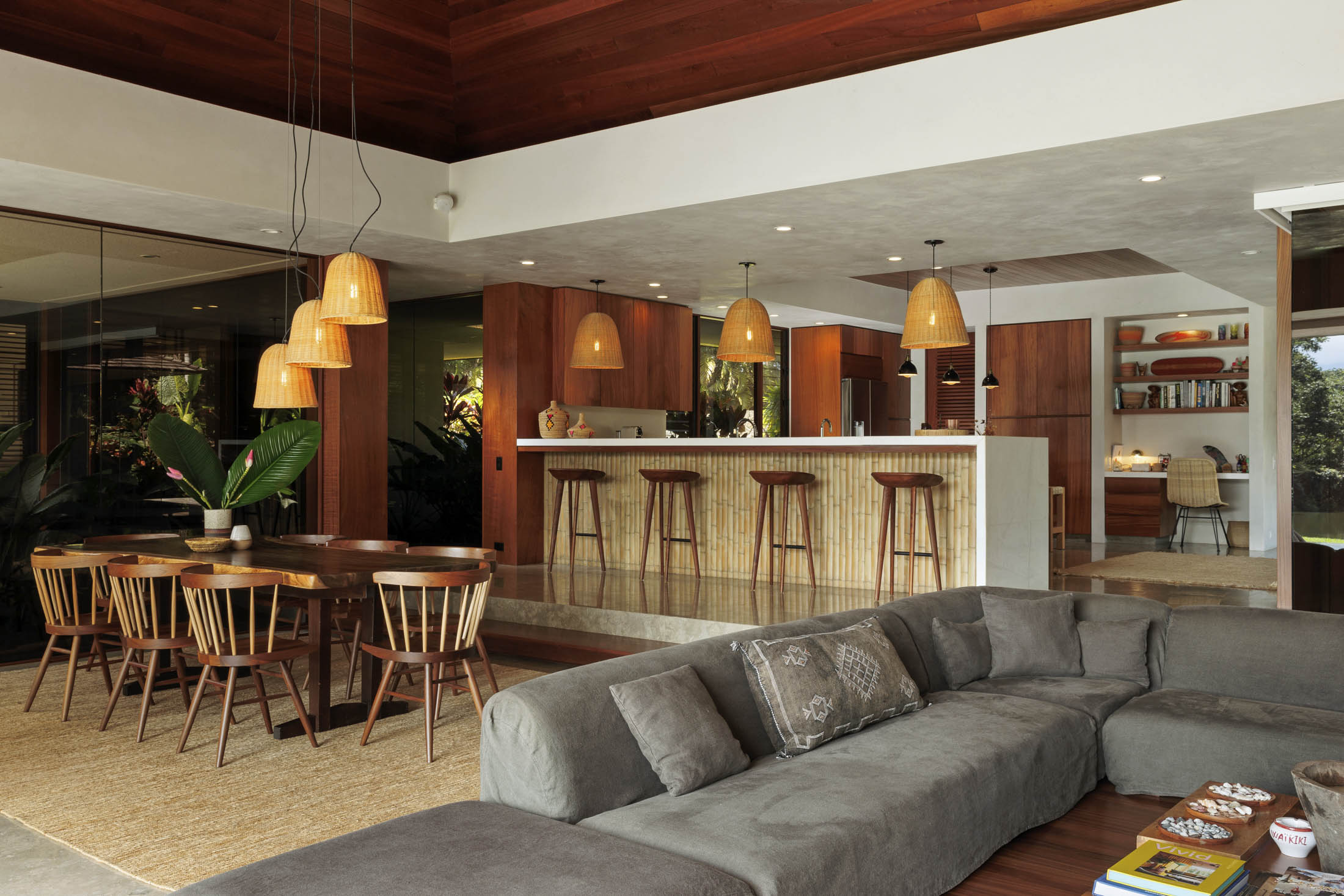 中央起居室和餐厅。摄影师:Gelston Dwight他以前去过夏威夷,尤其是为了一则卡尔文·克莱恩的广告,但是在黑色喜剧热带雷暴的片场上,他真正有机会去探索。