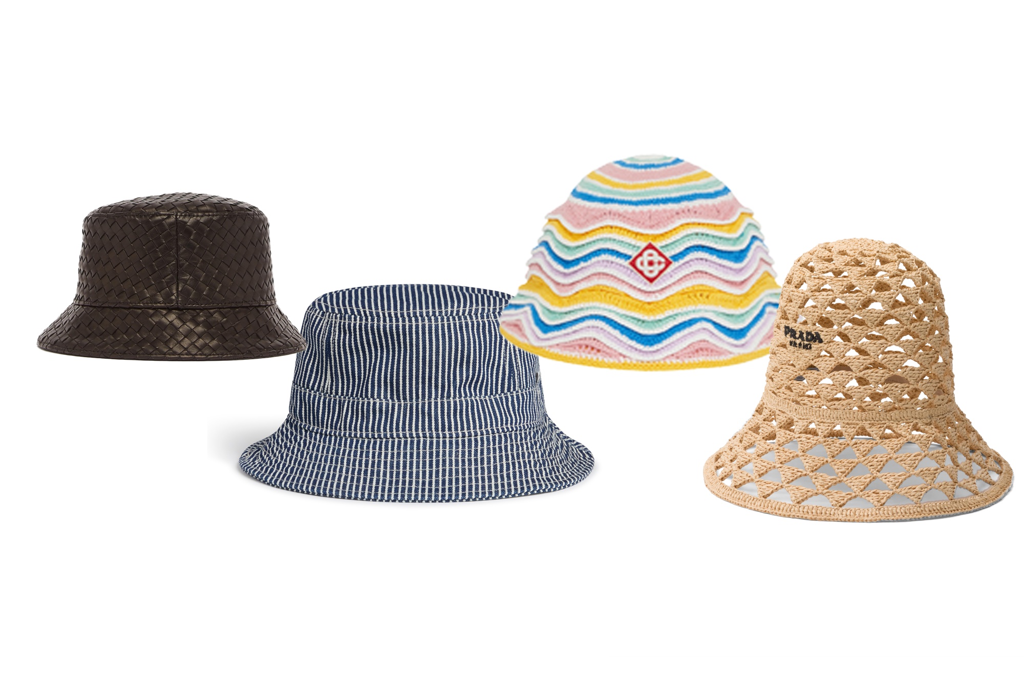 从左至右:Bottega Veneta, AYR, Casablanca Paris, Prada。来源:供应商Bottega Veneta该品牌标志性的Intrecciato编织在这款羊皮桶帽上显得俏皮。它也有绿色、蓝色和鲜艳红色可选,但上面的深棕色将轻松过渡到秋季。$1,500