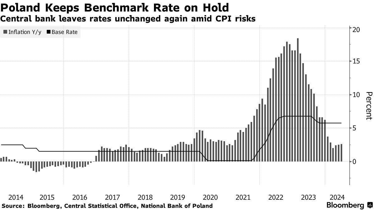 尽管一些政策制定者建议放松政策可能从明年第二季度开始,但波兰央行行长亚当·格拉平斯基表示,由于持续的价格压力,利率可能会保持在2026年之前保持不变。尽管通胀率下降至3%以下,官员们已经将基准利率保持在5.75%的水平达九个月。