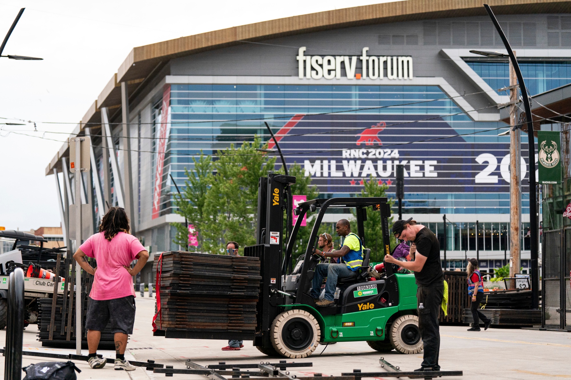 工人们在密尔沃基费泽维尔论坛附近安装安全围栏,为共和党全国代表大会做准备。摄影师:Al Drago/Bloomberg