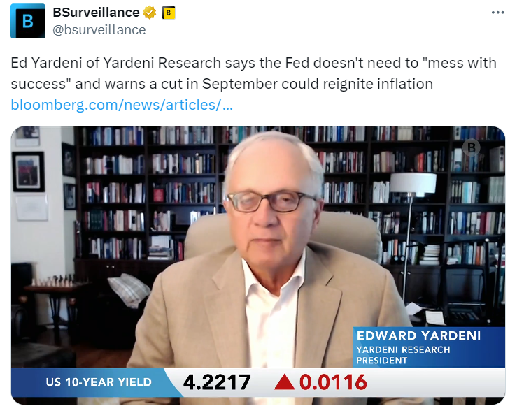 对于Yardeni Research的Ed Yardeni来说,风险更多地在于通货膨胀的回升,可能会在明年甚至更早出现,而不是许多人所意识到的。他认为联邦储备委员会没有必要急于降息,称他们不需要“破坏成功。”