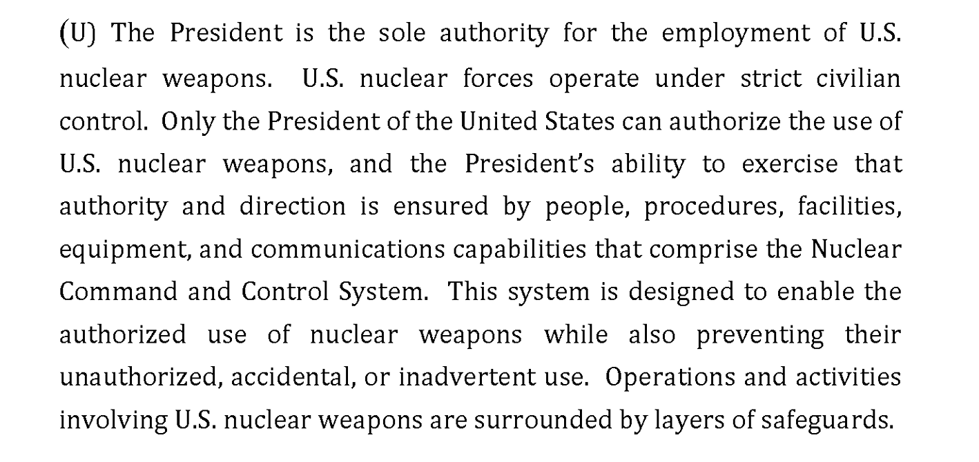 点击这里查看文档(第22页)在备忘录中,参谋长联席会议主席还“向众议院议长保证,核发射受到非常具体和审慎的程序控制。” 参谋长联席会议主席“反复表示,国防部已经建立了流程、协议和程序,以确保不会发生非法、未经授权或意外的发射。”
