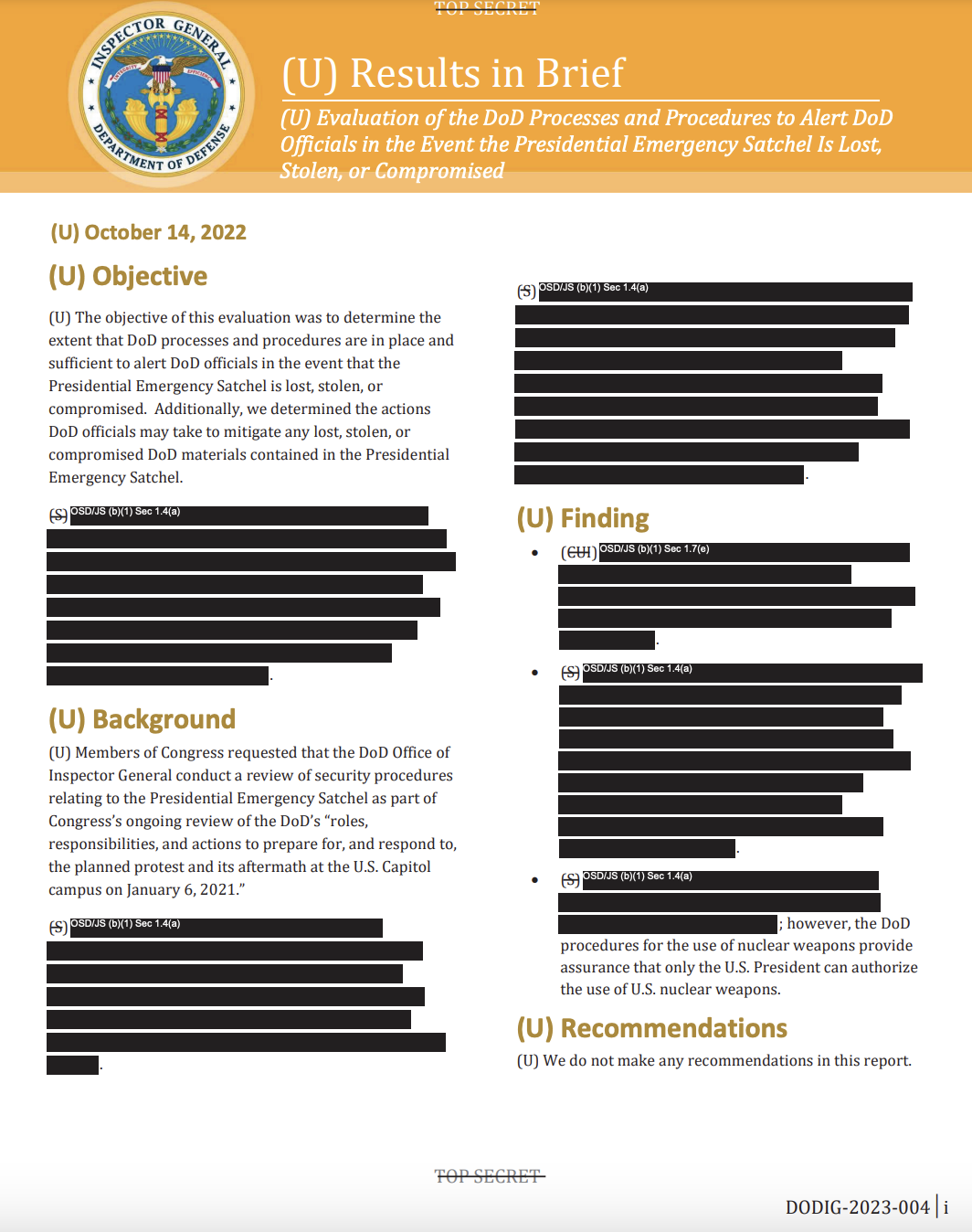 2021年1月6日,冲击国会大厦的暴徒距离副总统迈克·彭斯和备用“足球”仅100英尺。这让一些议员感到恐慌,并促使他们要求国防部的检察长调查核足球的安全程序。几年前,检察长发布了一份关于其审查的报告。尽管该文件被列为绝密并保密,但我还是能够强行获取了一份副本根据信息自由法案。毫不奇怪,这份报告被大量删节。不过,我还是能够获取到一些有趣的细节。继续阅读以了解更多。