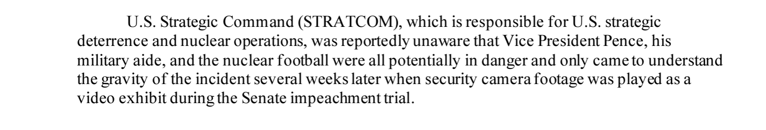 Lynch和Cooper指出,在2021年2月的前总统唐纳德·特朗普参议院弹劾审判期间,播放了一段视频,显示彭斯在“暴徒”危险接近他时被迅速带走,同时携带备用核足球的军事助手。