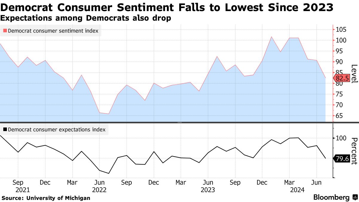 民主党人的消费者情绪和期望在总统乔·拜登在六月总统辩论中表现不佳后,跌至一年多来的最低水平。