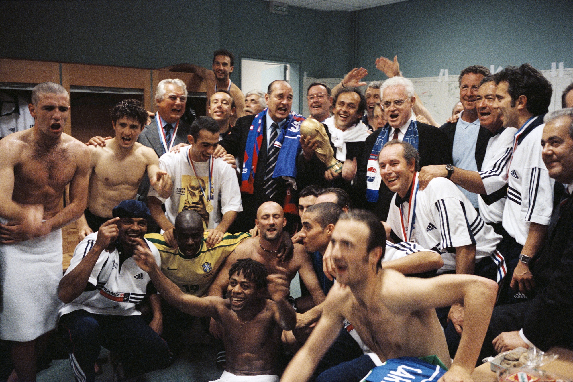 法国队在1998年与巴西的世界杯比赛中庆祝胜利,与法国总统雅克·希拉克和总理利昂内尔·若斯平合影。摄影师:Patrick Bruchet/Paris Match Archive/Getty Images1998年,法国的世界杯冠军球队由阿尔及利亚移民的儿子齐内丁·齐达内领导。该国欢呼其“黑、白、北非”球队 — 意思是黑人、白人和阿拉伯人。一代人后,反移民的极右势力在法国获得了支持,国家队队长姆巴佩,另一位非洲移民的儿子,在比赛初期呼吁选民阻止极右势力获得多数席位。