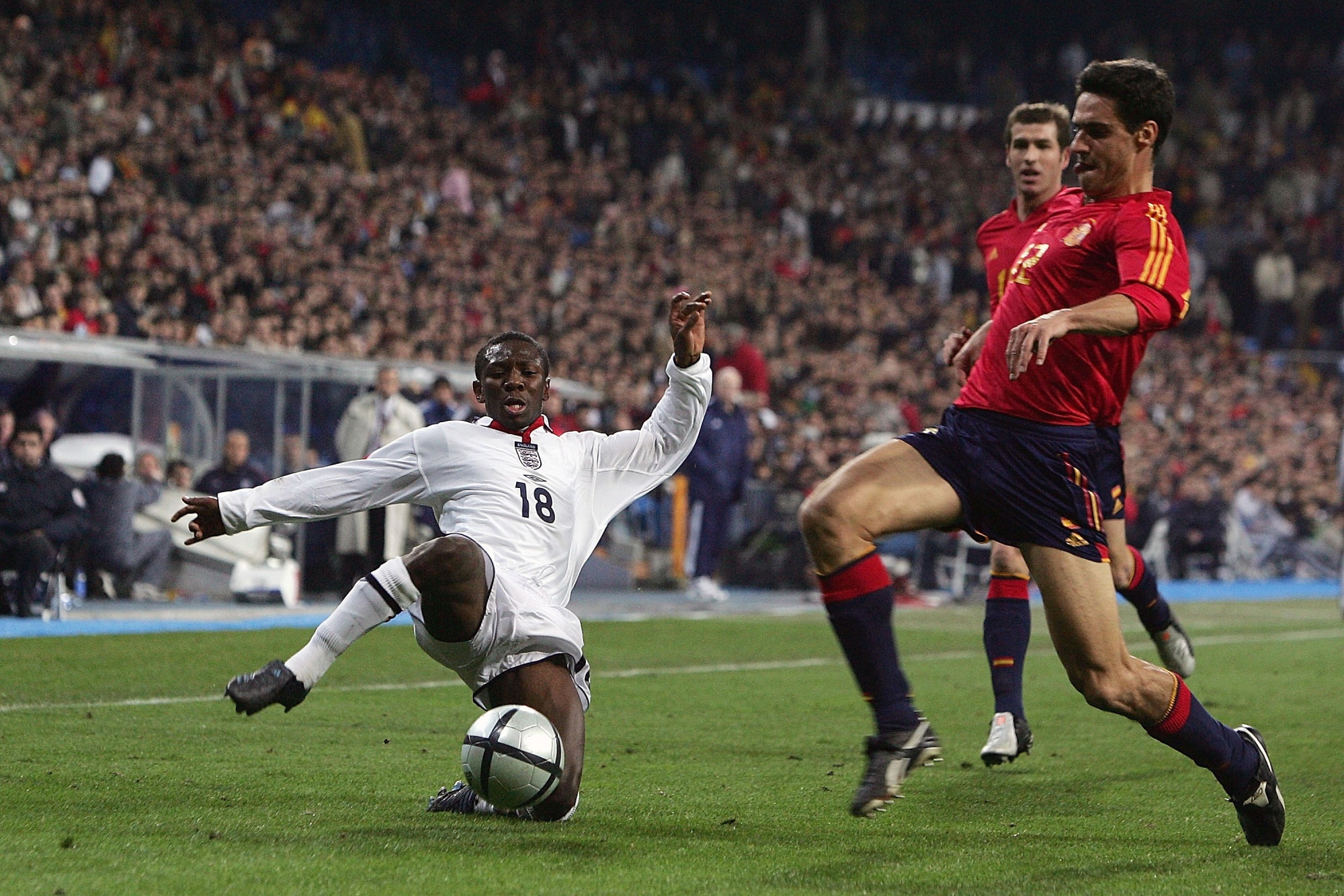 赖特-菲利普斯在2004年在马德里伯纳乌球场对阵西班牙的国际友谊赛中。摄影师:Ben Radford/Getty Images当两支球队在2024年欧洲足球锦标赛决赛上相遇时,西班牙的明星球员将是两位有色人种——毕尔巴鄂竞技队的尼科·威廉姆斯和巴塞罗那的16岁少年拉米内·亚马尔,他们都是第二代移民。这证明了某种程度上的进步——2004年11月对阵英格兰的西班牙队全是白人——但这种进步在最好的情况下也是脆弱和有条件的,对手们深知这一点。