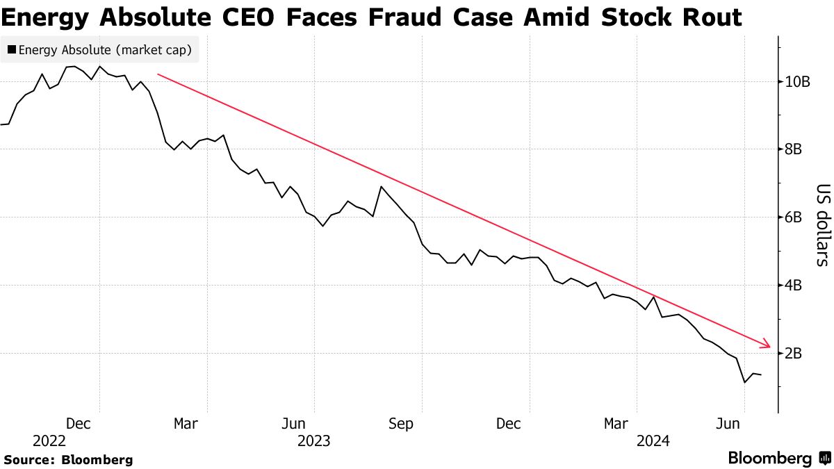 对Somphote的指控是在他试图消除投资者担忧关于曼谷上市公司能源绝对的财务状况之后几天提出的,该公司在六月份暴跌了51%,创下有史以来最大的月度跌幅。57岁的Somphote在上个月的股市暴跌中,他的净资产从两年前的48亿美元以上缩水,失去了亿万富翁的身份。能源绝对今年迄今为止下跌了70%,是MSCI亚太指数中近1400家公司中表现最差的。