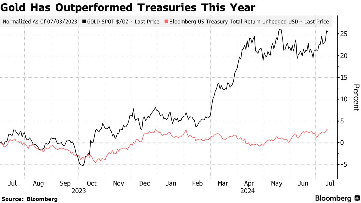 摄影师:乔·阿普尔/彭博社根据市场观察者的说法,在特朗普幸存刺杀未遂后,投资者最初将偏爱传统的避险资产,可能会倾向于与前总统特朗普赢得白宫的机会最相关的交易。