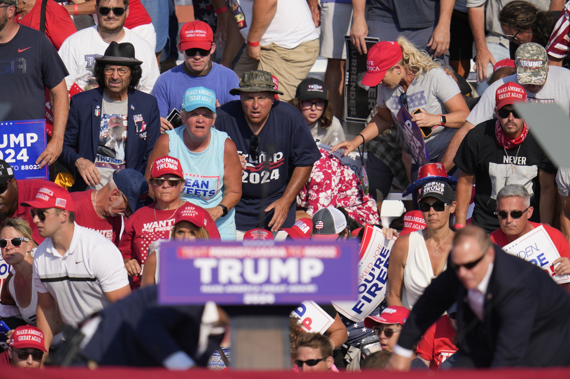 唐纳德·特朗普在宾夕法尼亚州巴特勒农场展览会上的竞选活动中被特勤局特工包围,日期为7月13日。
