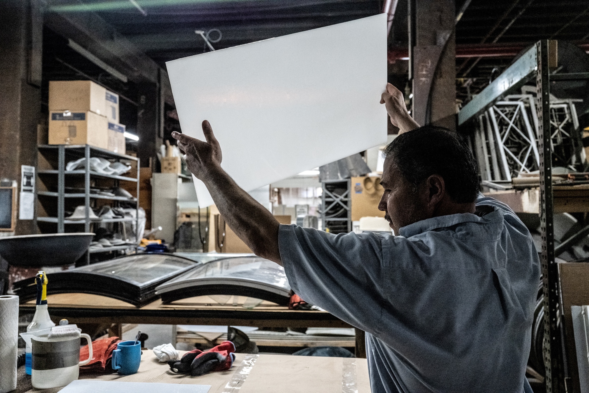 一名工人在纽约的玻璃厂检查一块玻璃的不透明度。