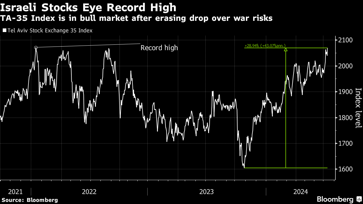 以色列股票上周曾短暂触及历史最高点,延续了从十月低点反弹的势头。巴克莱分析师表示,尽管持续的战争,该国银行具有弹性的基本面,关键的宏观指标表明经济活动逐渐改善。