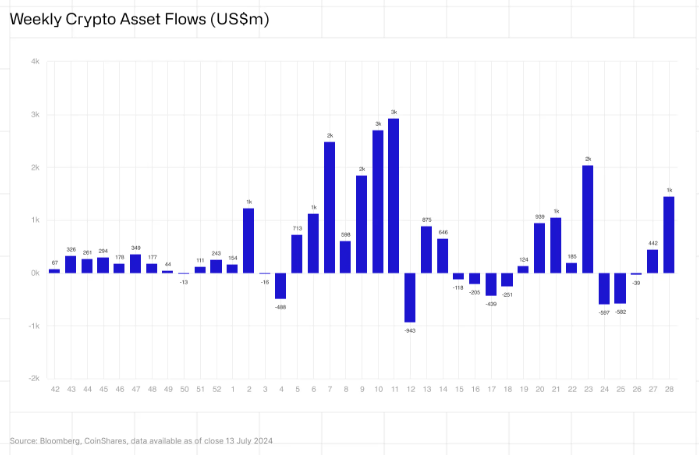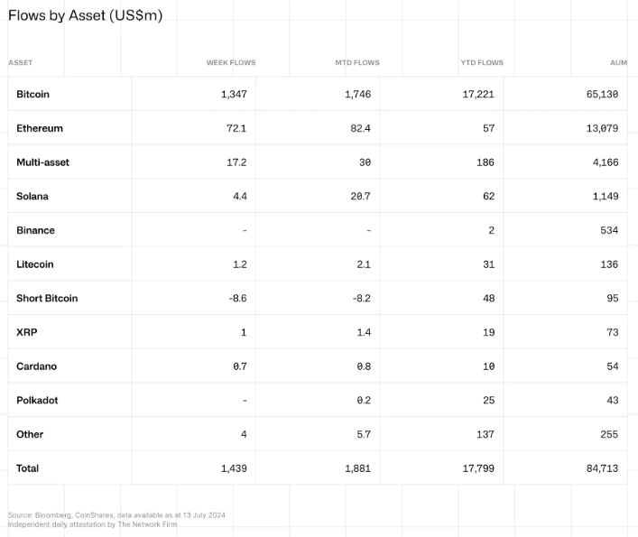 这三周的资金流入使总收益达到18.5亿美元。在此之前的两周,比特币基金损失了12亿美元。总体而言,根据CoinShares的数据,加密货币投资产品在截至7月12日的那周吸引了14.4亿美元的资金流入。