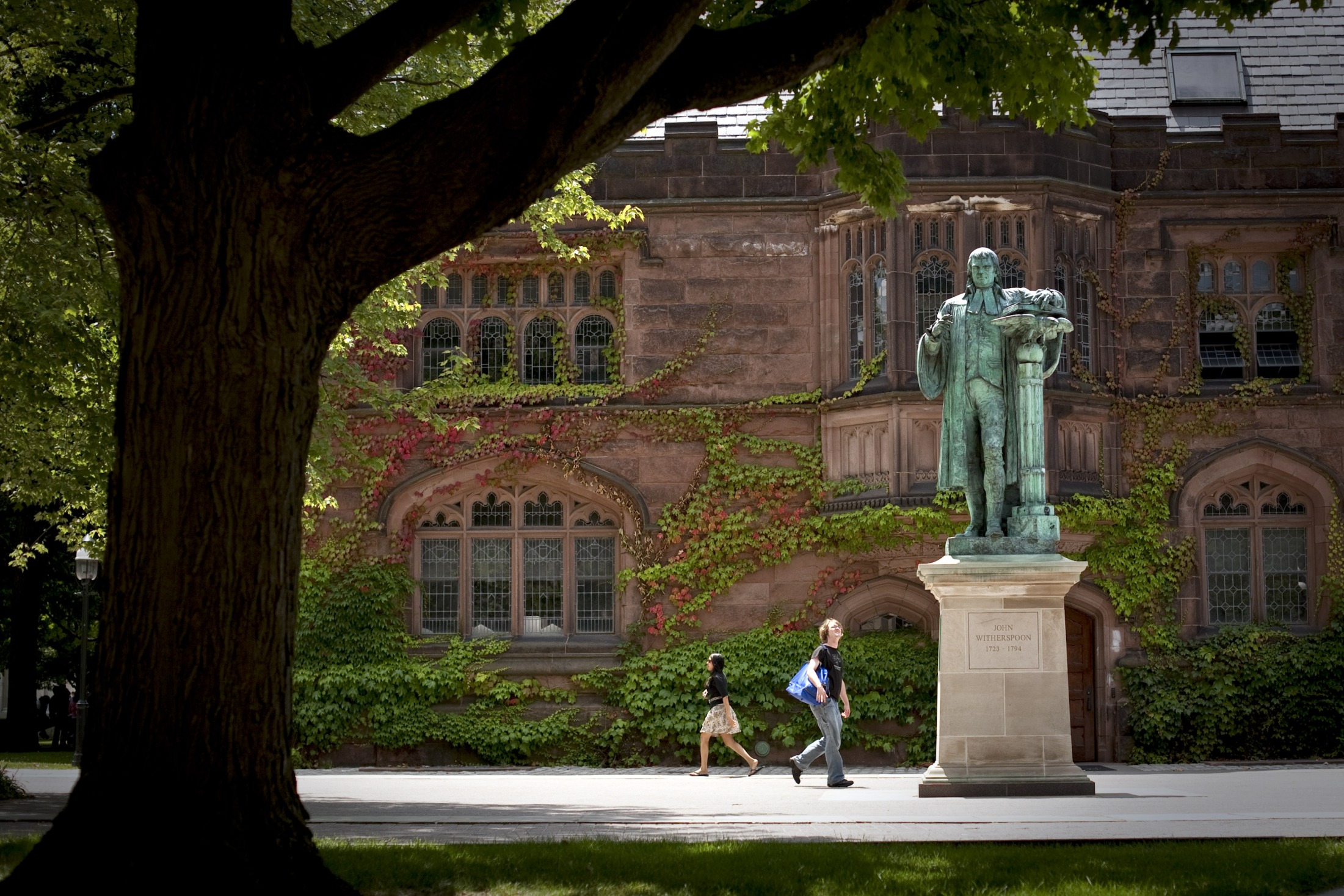 行人走过普林斯顿大学校园内前校长约翰·威瑟斯普恩的雕像。