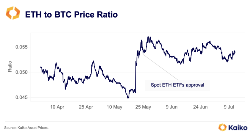 Kaiko指出,随着美国证券交易委员会批准以太ETF的第一阶段结束,以太相对于比特币的价格已经从0.045上升到约0.05。