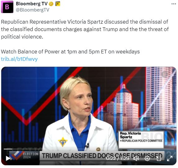 今天在彭博电视台的权力平衡早间节目中,主持人乔·马修和凯莉·莱因兹采访了共和党众议员维多利亚·斯帕茨,谈及对特朗普的机密文件指控的撤销以及政治暴力威胁。