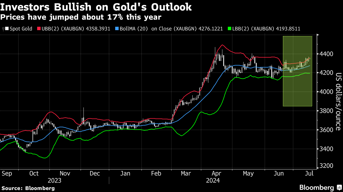- 金条本月上涨了4.1%,而资金管理人员将净多头押注增加到七周高位。