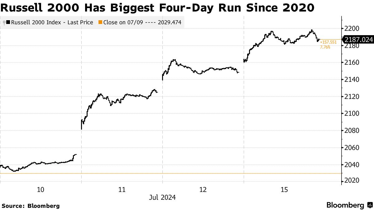 道琼斯工业平均指数创历史新高,特朗普任命JD·范斯为他的竞选搭档。特朗普媒体与技术集团股份有限公司飙升31%。保守派视频分享平台Rumble Inc.上涨21%。特朗普胜选的可能性提振了石油生产商、枪支制造商和私人监狱。他支持加密货币的立场推动了该行业。特斯拉公司因埃隆·马斯克支持特朗普而上涨。太阳能公司下跌,因为民主党被视为对该行业更友好。