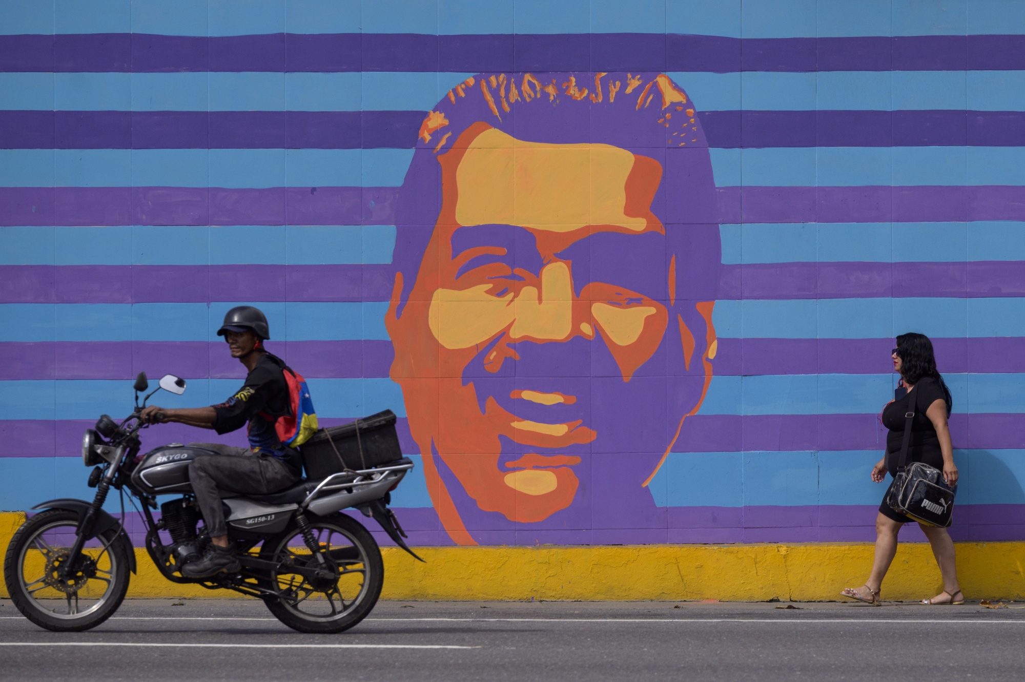 在2024年6月30日星期日,委内瑞拉总统尼古拉斯·马杜罗在加拉加斯举行的一次选举演习中得到支持的壁画。摄影师:Gaby Oraa/Bloomberg