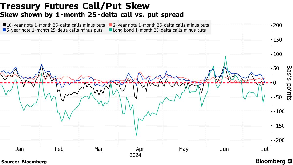 用于对冲曲线长端风险的溢价仍然偏向看跌期权,而前端和中部期权的溢价更接近中性。这种偏斜表明交易员更愿意支付更高的价格来对冲债券期权的下跌风险,而不是上涨风险。最近的国债流入中包括对长期波动结构的需求,其中包括一笔300万美元的九月跨式空头头寸,周五交易。