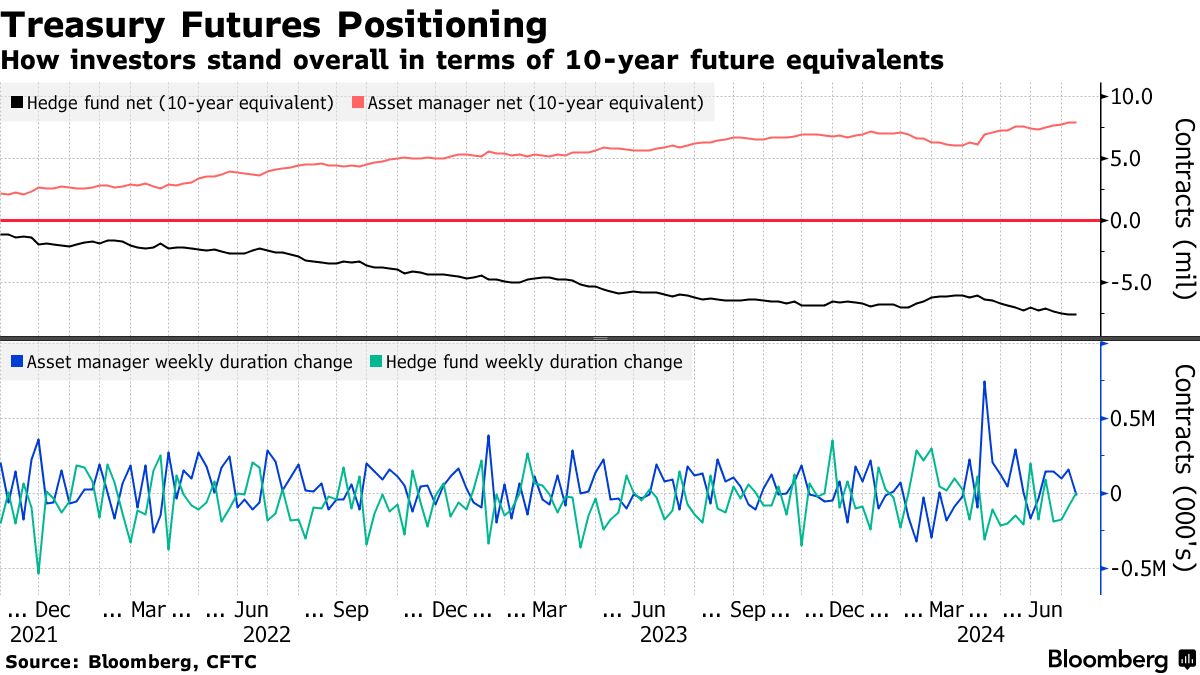 根据商品期货交易委员会的数据,在截至7月9日的一周内,对冲基金和资产管理公司的期货头寸变化各不相同,相对平静。该周最大的头寸变化出现在超长期国债期货上,资产管理公司减少了多头头寸,而对冲基金平仓了空头头寸。