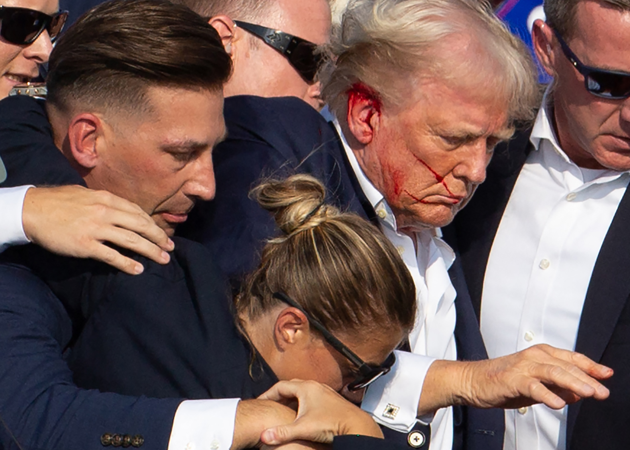 唐纳德·特朗普被血迹弄脏脸庞,被特勤人员包围,在宾夕法尼亚州巴特勒的一次竞选活动中被带离舞台,时间是7月13日。