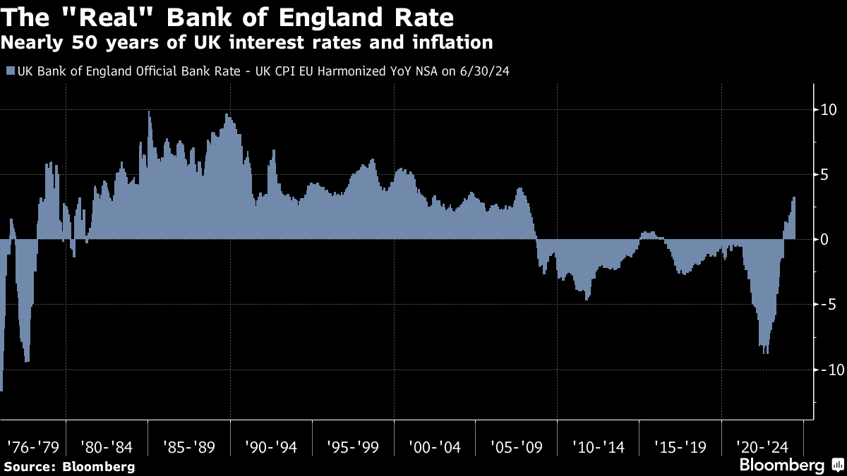 考虑到这一点,下面是一张“实际”英格兰银行利率的图表,追溯到20世纪70年代。也就是说,这是扣除年度通胀率(本例中为CPI)后的银行利率。正如你所看到的,我们现在接近2003年后(这是后点com恢复真正开始的时候)到2007年期间持续存在的范围的顶端。