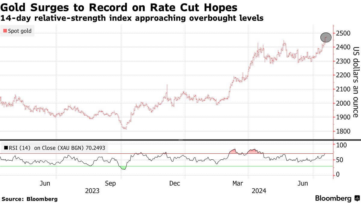 周三,金价一度飙升至每盎司2483.73美元的历史最高点,然后回落。周二,黄金上涨了1.9%,超过了五月份创下的历史最高点,因为交易员们纷纷加大押注,认为美联储会更早更深地降息,因为越来越多的迹象表明通胀正在朝着央行的目标降温。较低的借贷成本往往有利于这种无息资产。
