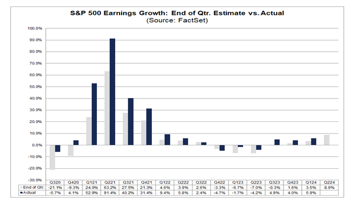 这张FactSet图表显示了季度末的估计值为灰色,实际盈利为深蓝色: