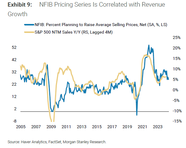 关于利润率,重要的是要了解收入与通货膨胀之间的关系。以下是摩根士丹利的图表显示价格(由计划提高价格的公司百分比表示)和指数级别的收入增长。价格上涨的环境在许多方面都是有害的,但确实使较小的公司更容易提高收入。随着通货膨胀呈下降趋势,利用这种关系来预测销售增长是有道理的: