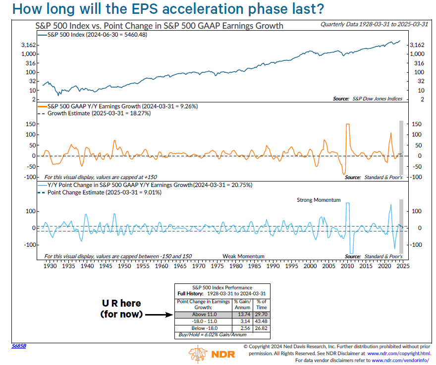正如Ned Davis研究策略师Ed Clissold和Thanh Nguyen所说,降低指引只是为了在几周后宣称胜利是虚伪的。相反,他们关注实际收益增长,并通过加速或减速的视角将其应用于股市。这张图表跟踪了市场的表现以及多年来的收益增长: