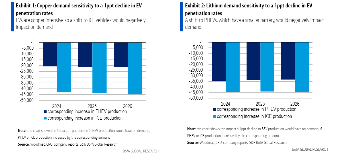 另一个可能的后果可能是中国电动汽车需求的减弱,即使其他国家仍无法与中国的价格竞争。电动汽车采用的放缓将对铜和锂产生连锁影响,这对于转向电动汽车至关重要。美国银行展示了电动汽车渗透放缓对这些金属的影响: