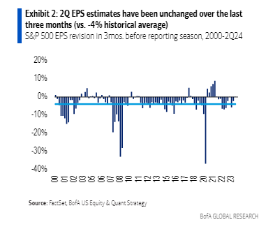收益超预期指标 — 标普500收益超出预期的百分比 — 预计将达到9%的同比增长。这与上一季度的7%相比 — 自2022年以来最小的超出 — 但仍然不算太好。分析师没有调整他们对第二季度的估计,他们对自己的预测很有信心。美国银行的这张图表显示了第二季度与以前估计的对比: