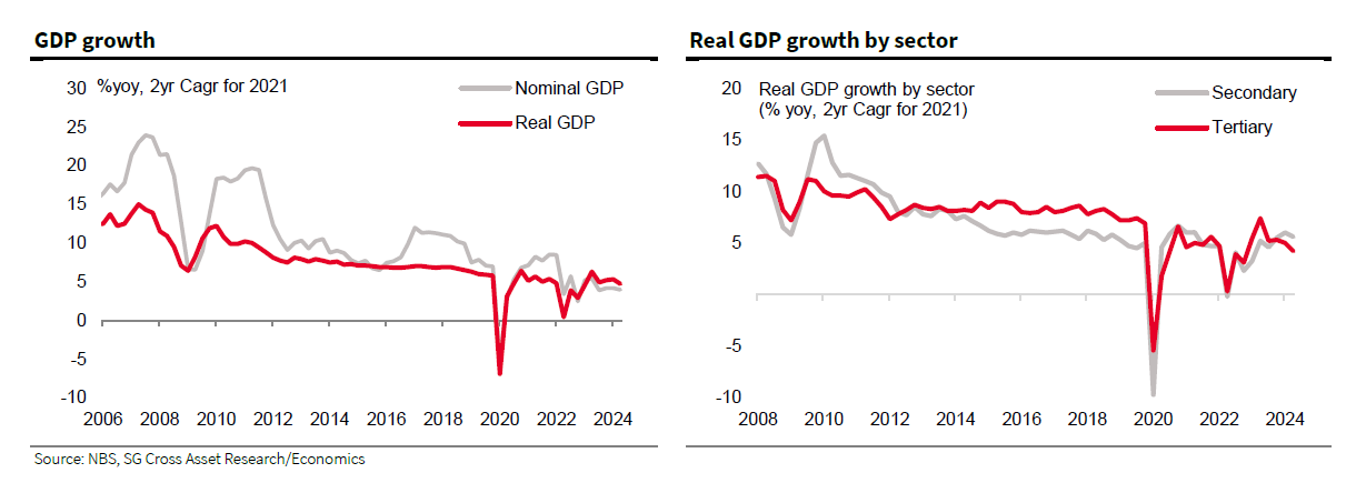 尽管消费支出可能仍然保持低迷,但中国制造商持续降价意味着出口在目前情况下应该仍然强劲,尽管美国和欧盟加征关税。再加上未来几个月内财政支出可能加大,这应该会导致短期内增长重新加速,尽管这种增长不太可能在中期内持续。