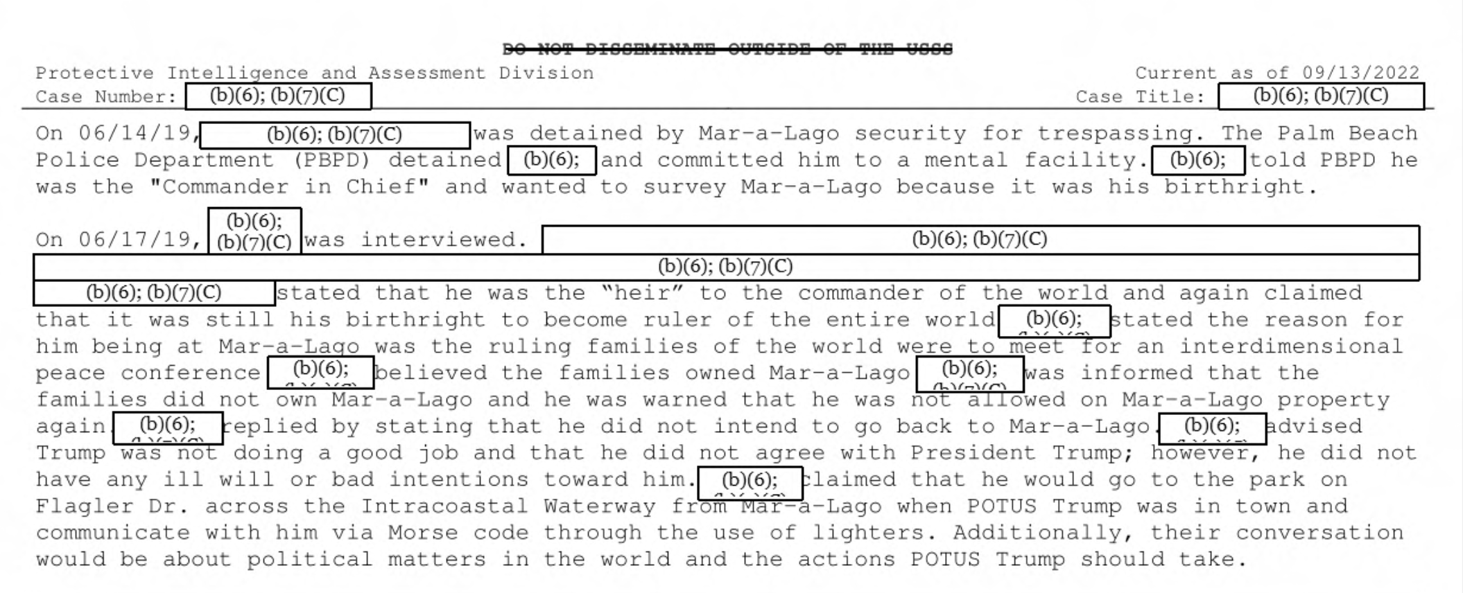 点击这里查看文件(第8页)大约六个月后,另一名男子因擅自闯入而被马阿拉戈安保人员和棕榈滩警察局警官拘留。他告诉他们他在那里是因为他“是‘总司令’,想要巡视马阿拉戈,因为那是他的天赋。” 他说“世界的统治家族”计划在特朗普的住所举行“一个跨维度的和平会议”。