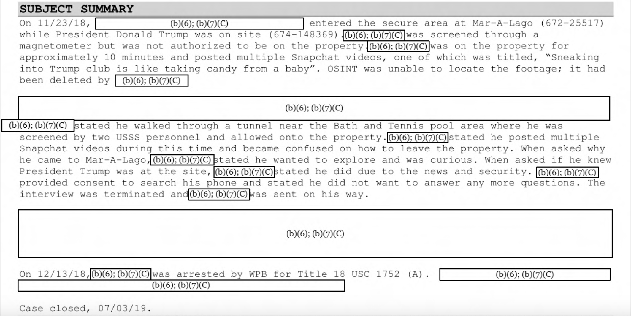 我最近收到的FOIA记录提供了更多见解。综合起来,它们揭示了数十起人们在特朗普在度假胜地时进入马阿拉戈的事件,尽管他们没有被授权在那里。在一些情况下,这些人被特勤局或马阿拉戈安保人员错误地放行。