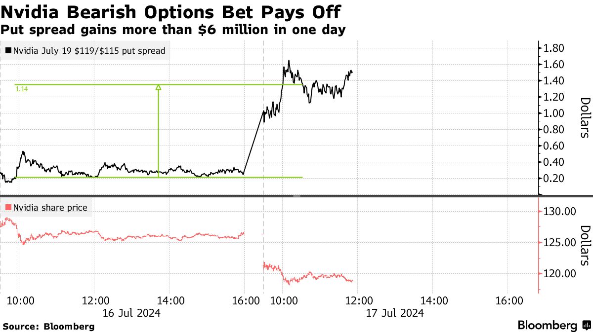这笔交易迅速获得回报,随着Nvidia和其他芯片制造商在周三早些时候下跌了多达6.5%,跌破了119美元,与美国加强对向中国出售芯片的限制威胁同时出现。Nvidia和其他科技巨头今年带动了更广泛的市场涨势,而周三的抛售导致标普500指数下跌超过1%。